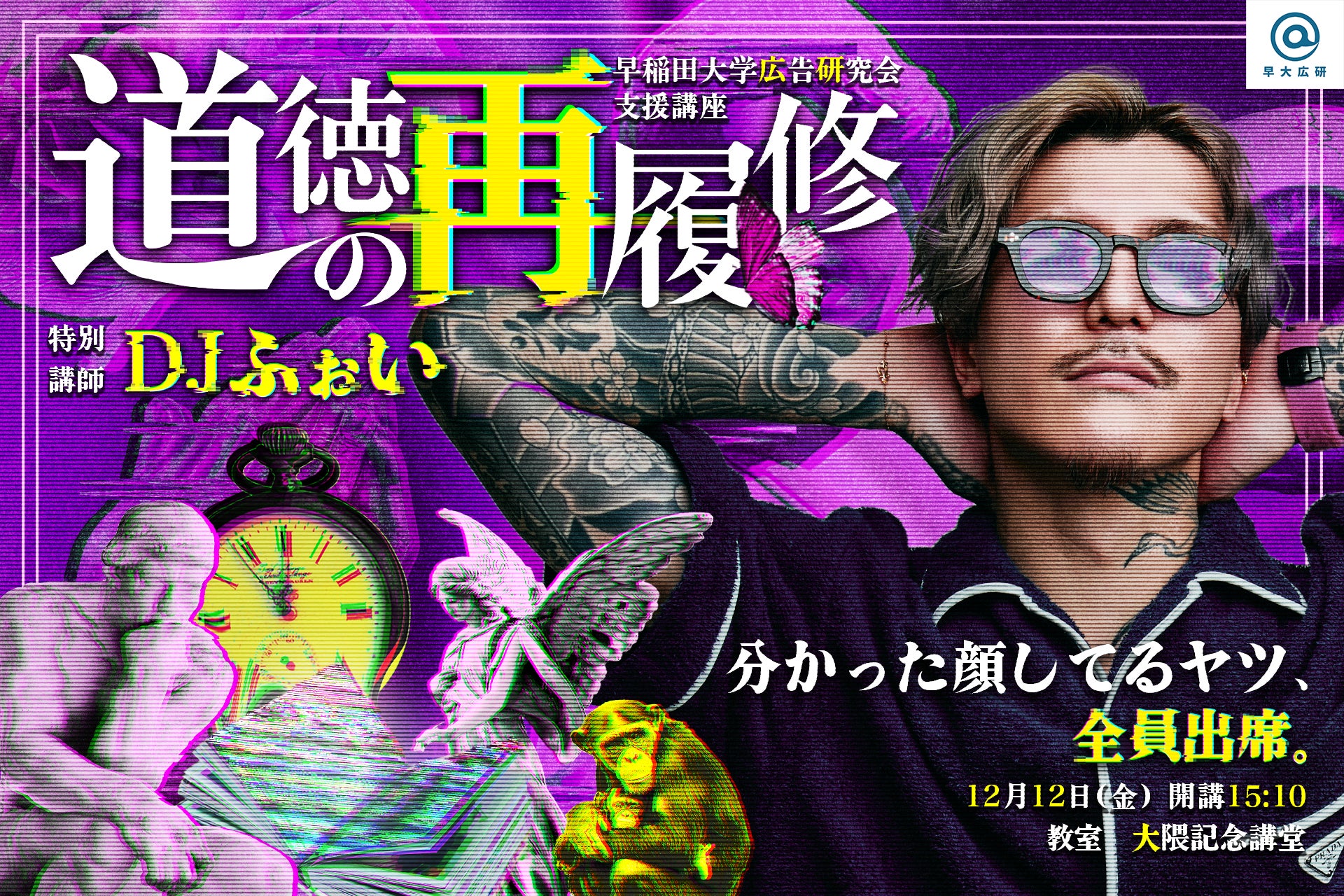 早稲田大学広告研究会は、2025年12月12日(金)15:10から、早稲田大学大隈記念講堂にてDJふぉいを講師に迎えた特別講義型イベント「道徳の再履修」を開講する。